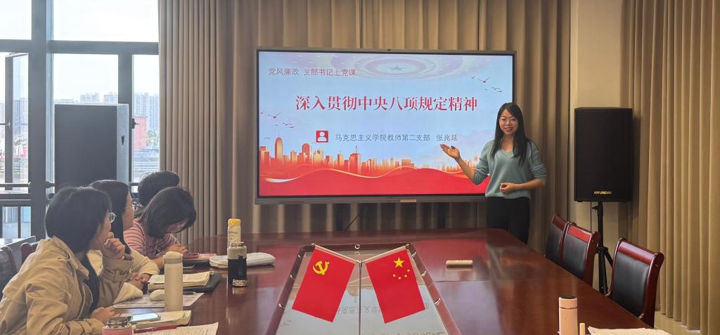 党支部书记张兆延做了题为“深入贯彻中央八项规定精神”的专题党课,她给大家讲述了中央八项规定精神的背景与意义、中央八项规定精神的内容与成效、当前作风建设的挑战与举措、加强党的作风建设的任务要求等四个方面的内容。