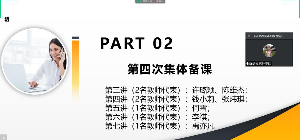 接着,第四次集体备课研讨正式开始。许璐颖、陈雄杰、钱小莉、张炜琪、何雪、李祺、禹亦凡7位老师分别就第三讲至第七讲的内容,结合学生专业特点,分享教学思路。