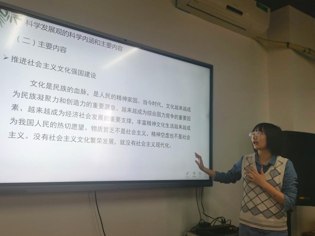 本次活动重点围绕《毛泽东思想和中国特色社会主义理论体系概论》第七章展开。从教学目标和内容看,陈老师将“科学发展观”科学内涵和主要内容作为重、难点进行突破;从教学方法看,她紧扣学生年龄和兴趣特点,灵活运用案例教学法、自主学习法、主题讨论法和探究式教学法,提供大量教学资源。