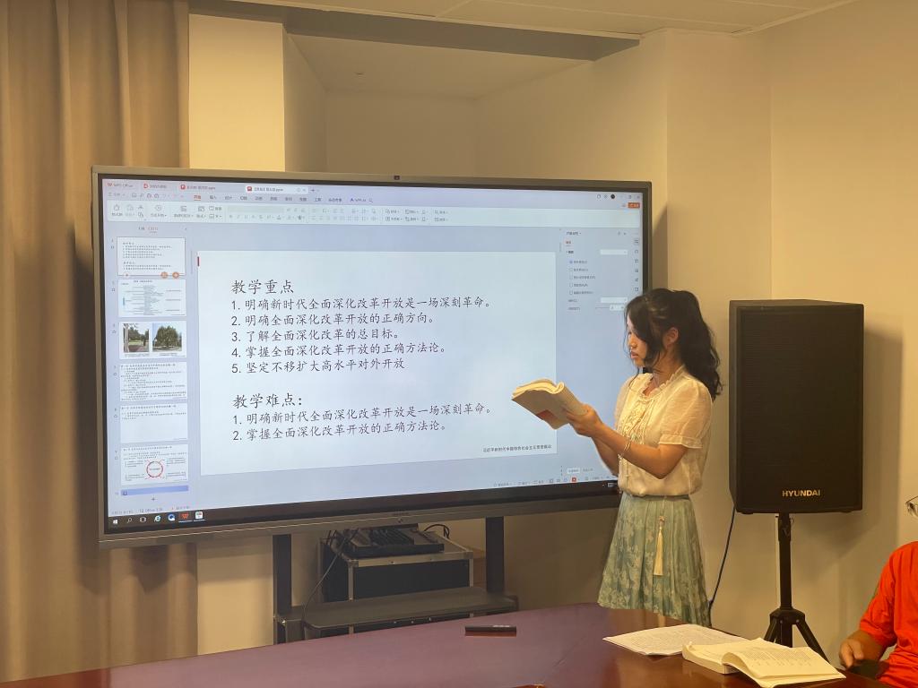林钊安主讲第四章“坚持以人民为中心”,他从“江山就是人民,人民就是江山”“坚持人民至上”“全面落实以人民为中心的发展思想”三个部分展开论述,结合“江山就是人民,人民就是江山”的深刻内涵,重点讲解人民是历史的创造者,是真正的英雄。林双程主讲第五章“全面深化改革开放”。她从“改革开放是决定当代中国命运的关键一招”“统筹推进各领域各方面改革开放”“将改革开放进行到底”三个部分展开讲述,结合党的二十届三中全会内容,重点讲解坚持全面深化改革开放的正确方向及全面深化改革总目标。随后,老师们围绕教学重难点和党的二十届三中全会精神如何融入课堂展开了深入讨论。