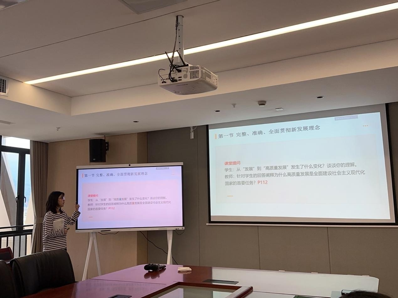 曾玉婷老师主讲第六章“推动高质量发展”的教学内容,她以新发展阶段、新发展理念、新发展格局为主线,阐释以新发展理念引领高质量发展,构建高水平社会主义市场经济体制和把握未来发展主动权,建设现代化经济体系。卓龙锋老师主讲第七章“社会主义现代化建设的教育、科技、人才战略”的教学内容,他围绕“教育、科技与人才”三者关系,从理论、战略和理念原则三个维度详细叙述为什么说教育、科技、人才是全面建设社会主义现代化国家的基础性、战略性支撑,教学中运用相关案例对加快建设教育强国、科技强国、人才强国进行具体阐释。与会老师针对教学目标、教学重难点及授课内容等进行分析讨论,提出教学建议。