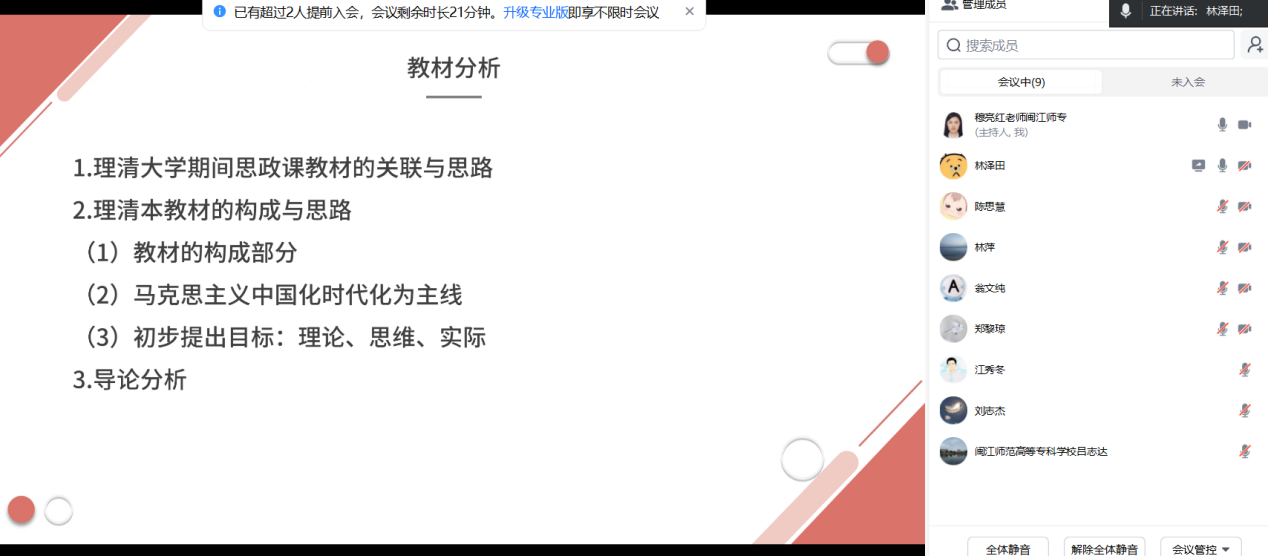 2月13日上午,“毛中特”教研室开展线上集体备课。本次集备由教研室林泽田老师主讲。首先,他围绕导论“马克思主义中国化时代化的历史进程与理论成果”进行说课。他从教材内容入手,结合学生的学情,详细解读了导论中“为什么要实现马克思主义中国化时代化”“马克思主义中国化时代化的科学内涵、历史进程和理论成果”等重要知识点。随后,翁文纯老师选取导论章节中“马克思主义中国化时代化的提出”进行片段教学。他通过精心设计的教学环节和互动方式,生动地呈现了如何向学生阐明“为什么要实现马克思主义中国化时代化”这一重要问题。在集体讨论环节,老师们针对说课和片段教学情况以及导论章节的教学重难点展开热烈讨论和交流。