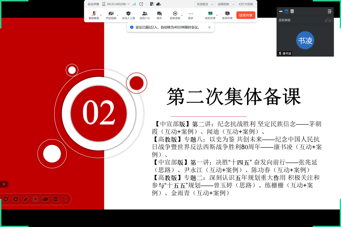 首先,金雨青对近期线上教学、教学考勤等工作作出安排。在集体备课环节,茅朝霞、闻迪、康书凌三位老师围绕中宣部版本第二讲“纪念抗战胜利 坚定民族信念”、高教版专题八 “以史为鉴 开创未来——纪念中国人民抗日战争暨世界反法西斯战争胜利80周年”教学内容,系统分享了教学案例与授课思路。