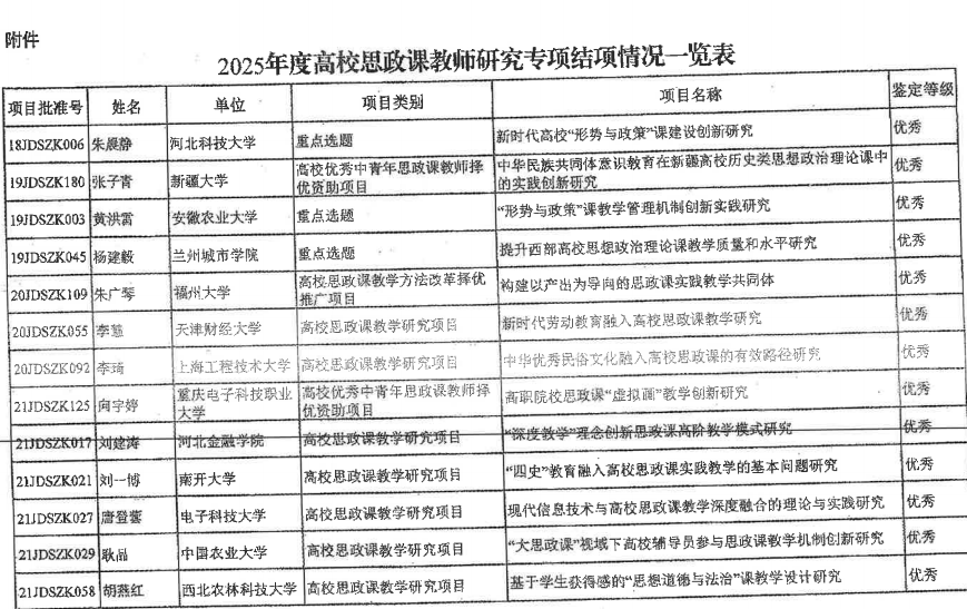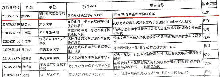 近日,《教育部社科司关于2025年办理高校思政课教师研究专项结项情况的通报》显示,我院党总支书记洪书源教授主持的课题项目《“四史”教育的整体性构建研究》顺利结题并获评优秀等级。本次全国203个项目参与结项验收,其中24个获评“优秀”,148个“合格”通过。