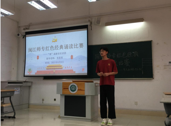 为庆祝中国共产党成立100周年,6月9日青说新语宣讲团于旗山校区教学楼3012教室举办“闽江师专红色经典诵读比赛”。本次比赛邀请张渊老师担任评委,全校各系20位选手各展才能,共同为观众献上一场激情饱满的朗诵盛宴。