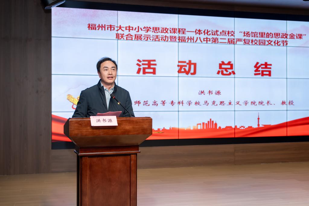 福州市大中小学思政课程一体化试点校(第二组)召集人、我校马克思主义学院院长洪书源作总结发言。他指出,此次活动的成功举办不仅让师生们深刻领略了船政文化的独特魅力和深厚底蕴,也展示出思政教育的创新活力。他强调,此次活动是福州市大中小学思政课程一体化建设的一次重要探索和生动实践,进一步深化了“大思政课”实践教学。试点校将继续优化思政课程体系,加强师资队伍建设,提升思政课教学的针对性和实效性,为培养具有家国情怀、国际视野和创新能力的新时代青年贡献力量。