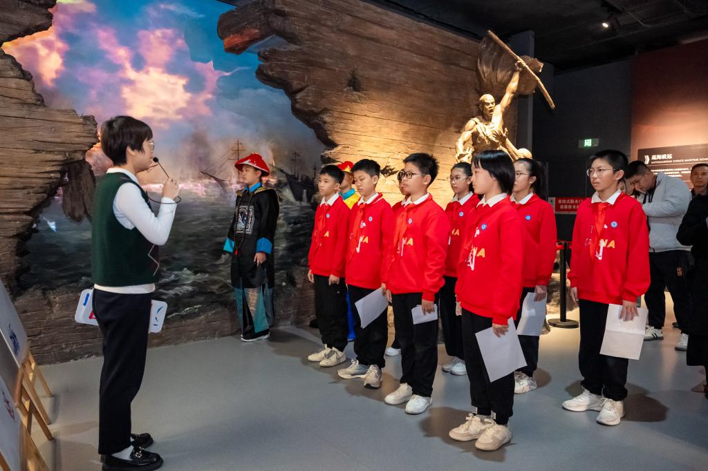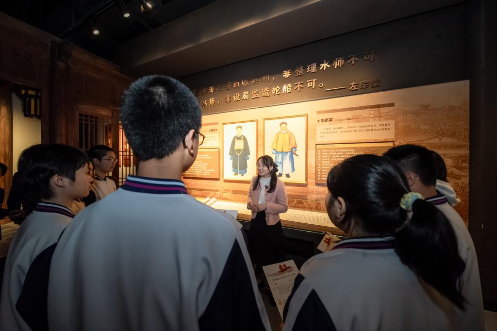 在场馆解说员的带领下,来自福州财政金融职业中专学校、福州第八中学、闽江师范高等专科学校、福州第七中学、福州市仓山区第六中心小学的师生依次在中国船政文化博物馆内五个不同地点,开展“场馆里的思政课”现场教学。