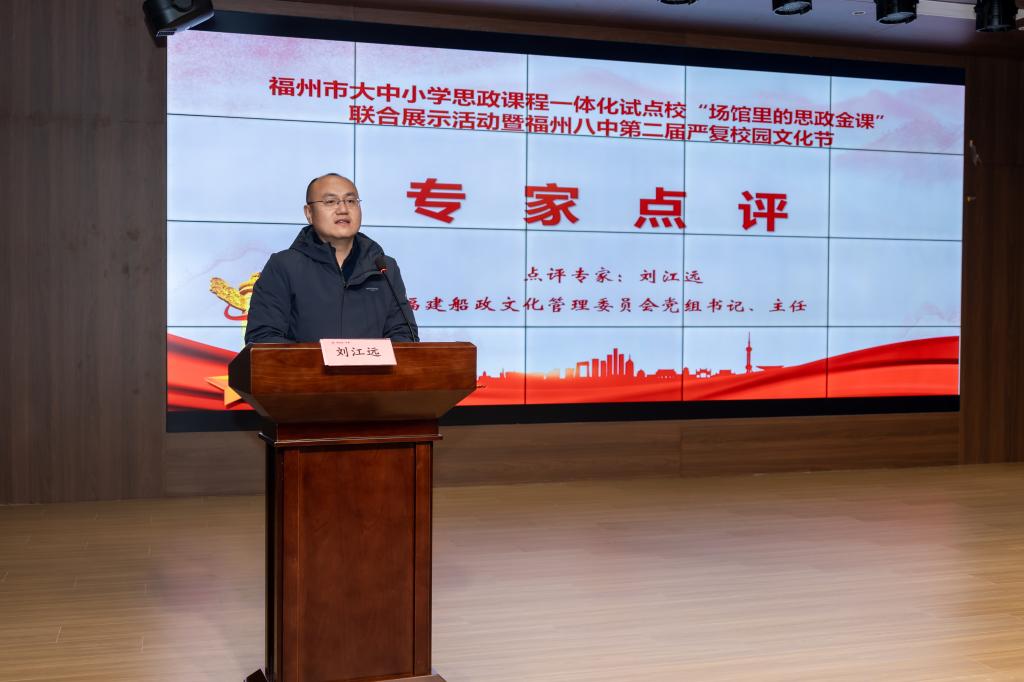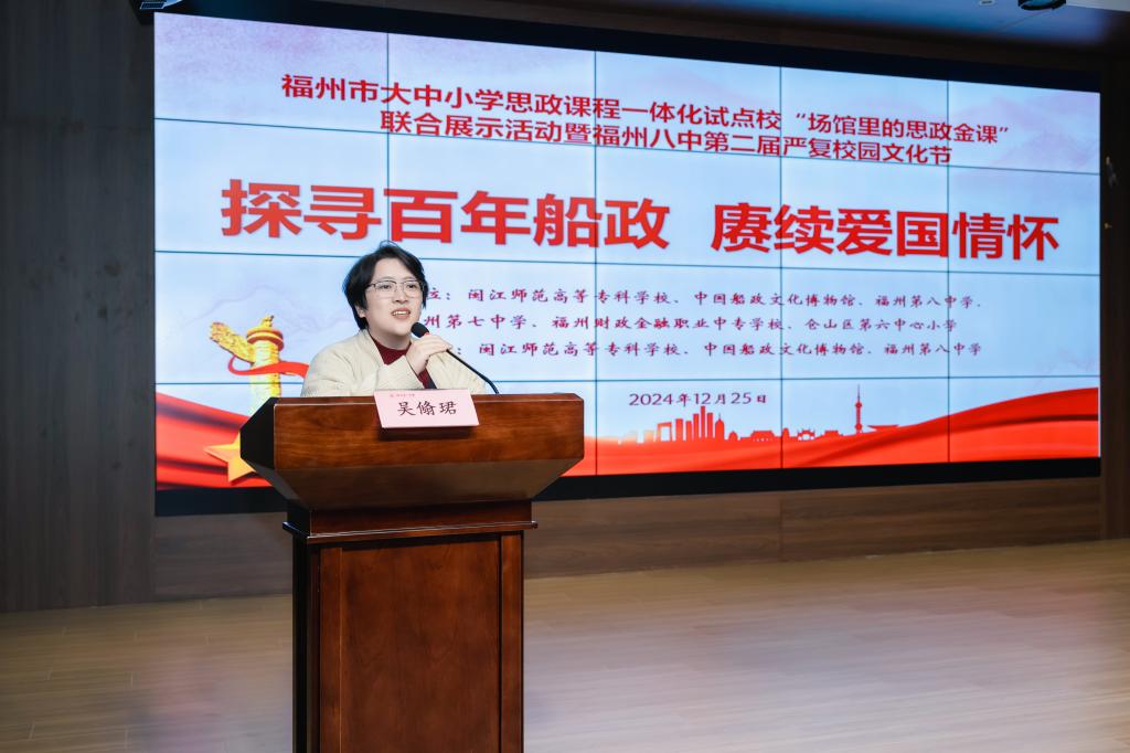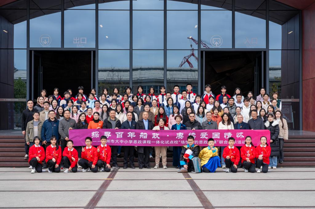 12月25日下午,我校作为牵头单位的福州市大中小学思政课程一体化试点校(第二组)以“探寻百年船政,赓续爱国情怀”为主题的“场馆里的思政金课”联合展示活动在中国船政文化博物馆成功举办。本次活动由福州市教育局指导,我校与试点校(第二组)其他四家成员单位福州第八中学、福州第七中学、福州财政金融职业中专学校、福州市仓山区第六中心小学以及中国船政文化博物馆联合主办,由我校、中国船政文化博物馆、福州第八中学联合承办。福建船政文化管理委员会党组书记、主任刘江远,福州市教育局思政处副处长吴翛珺,试点校(第二组)成员单位领导、师生代表100余人参加活动。