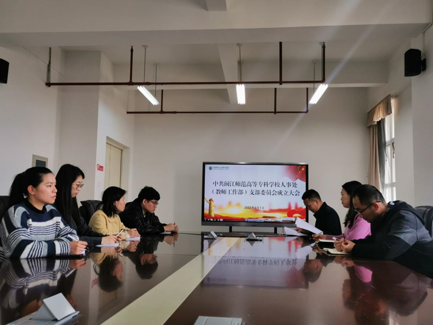 经中共闽江师范高等专科学校机关党总支批准,2022年3月1日中共闽江师范高等专科学校人事处(教师工作部)支部委员会在旗山校区综合楼七楼会议室召开成立大会。会议由人事处叶华处长主持,人事处全体党员参加会议。