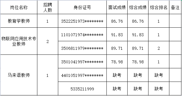 公示结束将按照考试综合成绩从高分到低分的顺序,且考生面试成绩达到规定的成绩合格线80分(马来语教师岗位合格线为70分)后,以1:1比例确定进入体检和考核的人选。具体体检、考核安排另行通知。