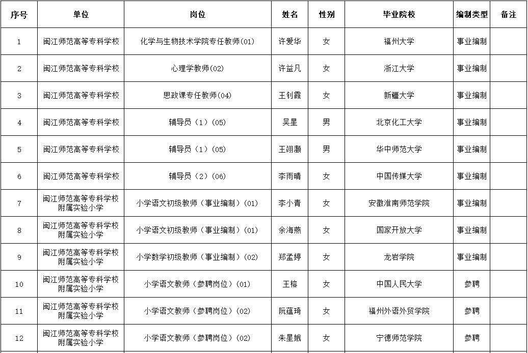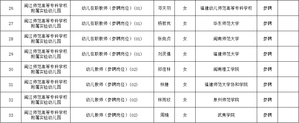 按照《关于印发〈福建省省属事业单位公开招聘工作人员考试暂行办法〉的通知》(闽人发〔2006〕11号)等文件要求,在笔试(部分岗位)、面试、体检和考察合格的基础上,确定许爱华等33名同志为拟聘用人选,现向社会予以公示。公示期间,如有问题,请及时反映。