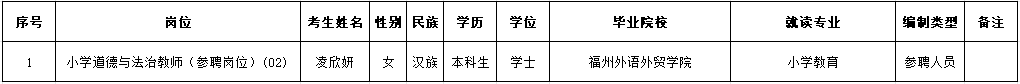 按照《关于印发〈福建省省属事业单位公开招聘工作人员考试暂行办法〉的通知》(闽人发〔2006〕11号)等文件要求,在笔试、面试、体检和考察合格的基础上,确定凌心妍同志为拟聘用人选,现向社会予以公示。公示期间,如有问题,请及时反映。