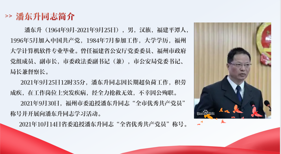 会上,各支部书记带领大家学习了潘东升同志从警以来,始终忠诚于党、忠于人民,把公安工作当作毕生的事业,始终将群众的利益摆在首位的先进事迹。大家学习到,潘东升同志是新时代共产党人的榜样,他用生命和行动诠释了人民公安为人民的职责使命,是身边最真实的好榜样。随后与会同志积极发言心得体会,进行热烈讨论。