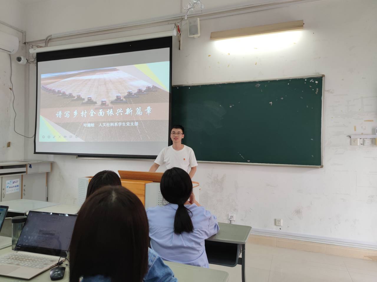 为充分调动党员干部发挥先锋模范作用,提升教师党员理论水平,10月20日,学生党支部书记叶懿蛟同志以“谱写乡村全面振兴新篇章”为主题,给人文社科系学生党支部与教师第二党支部党员上党课。