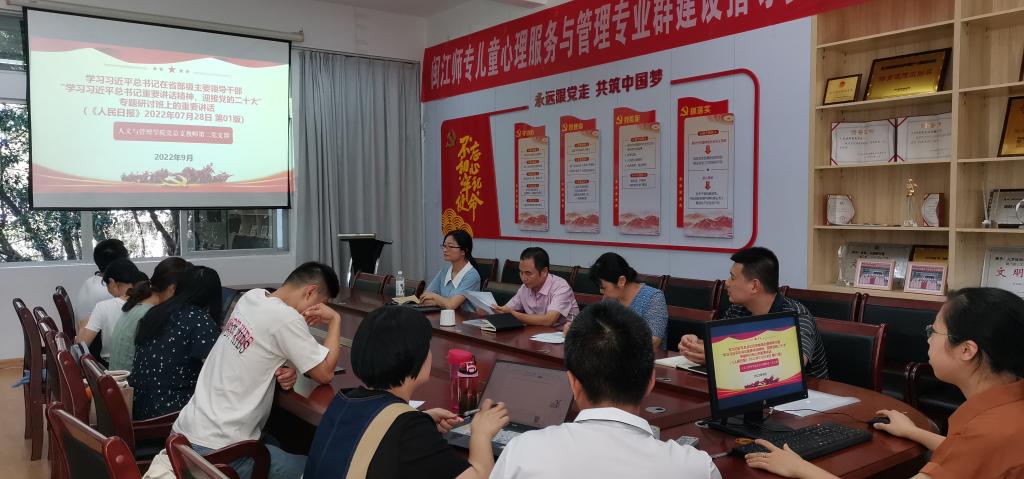 9月21日下午,人文与管理学院党总支所属各支部于仓山校区开展政治理论专题学习。本次学习的内容为:学习习近平总书记在省部级主要领导干部“学习习近平总书记重要讲话精神,迎接党的二十大”专题研讨班上的重要讲话;专题学习《闽山闽水物华新——习近平福建足迹》《习近平谈治国理政》(第四卷)。本次学习由各支部书记分别主持,各支部教师党员参加。