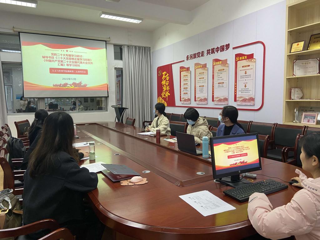 2022年12月7日下午,人文与管理学院党总支所属各支部于仓山校区开展政治理论专题学习。本次学习的内容为党的二十大专题学习研讨:辅导书目《二十大党章修正案学习问答》、《中国共产党第二十次全国代表大会文件汇编》等学习材料。本次学习由各支部书记分别主持,各支部教师党员参加。