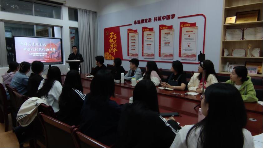 为推动学习贯彻习近平新时代中国特色社会主义思想主题教育不断走深走实,进一步让支部成员和入党积极分子在党课学习中深刻感悟真理伟力,凝聚奋进力量。11月11日下午,人文与管理学院学生支部书记叶懿蛟在仓山校区3楼会议室为学生支部党员及70期入党积极分子讲授主题为“开辟马克思主义中国化时代化新境界”的党课。