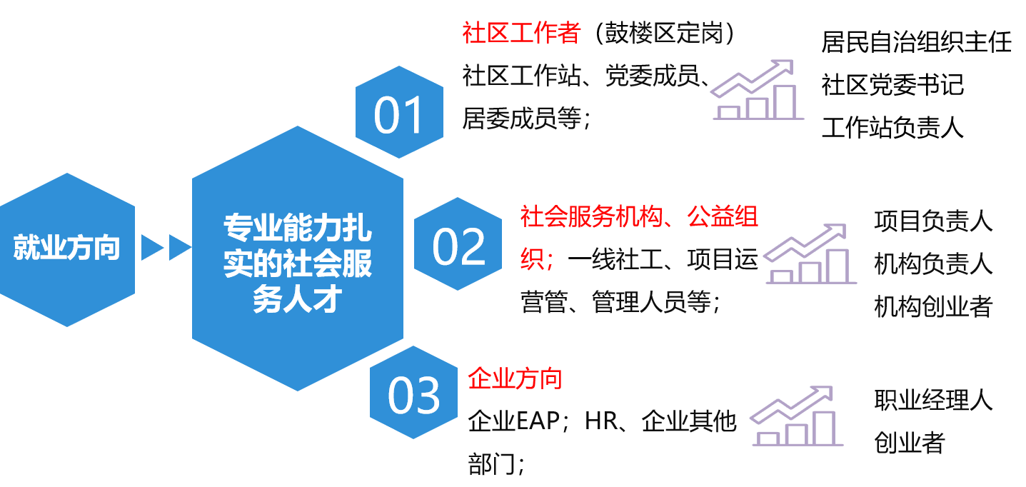 毕业后除了鼓楼区组织部安排的定向就业去向之外,还可以往民政、妇联、慈善机构、社会团体机构、社区服务机构、街道办事处、专业社会工作服务机构等方向发展,也可以选择继续深造,升本路径顺畅。