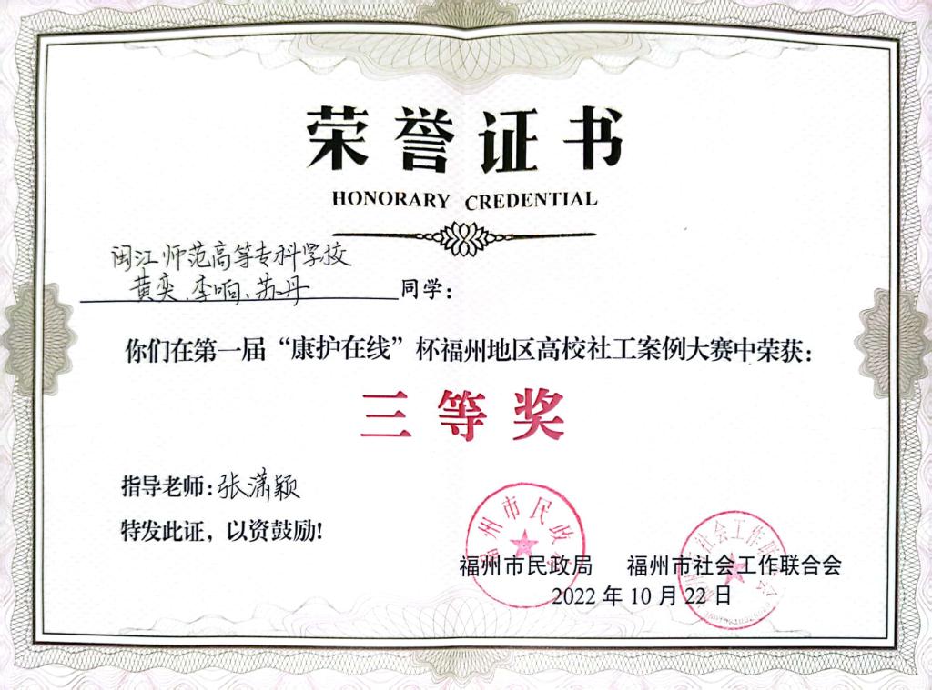 简介:中共党员,助理社会工作师,曾获2019年闽江师专优秀毕业生,2018年福建省”创青春“大学生公益创业大赛铜奖,2022年3月在家乡组织抗疫事迹获漳州市委机关报《闽南日报》报道