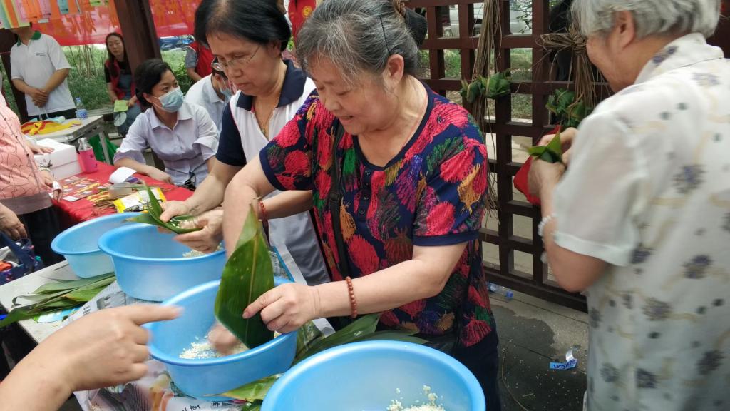社会工作专业的同学们五月份开始参与了整个活动的策划。活动当天,同学们早早地来到陆庄社区的白马河公园熟悉场地,随后协助社区的工作人员搬运物资、布置场地。社区的工作人员向我们介绍了本次活动分为文艺表演、志愿服务、以及包粽子比赛三个别出心裁的环节,带领居民领略不一样的端午风采。整个活动内容丰富多彩,现场十分有序,居民们的积极性极高。同学们与居民们都兴致昂扬,乐在其中。