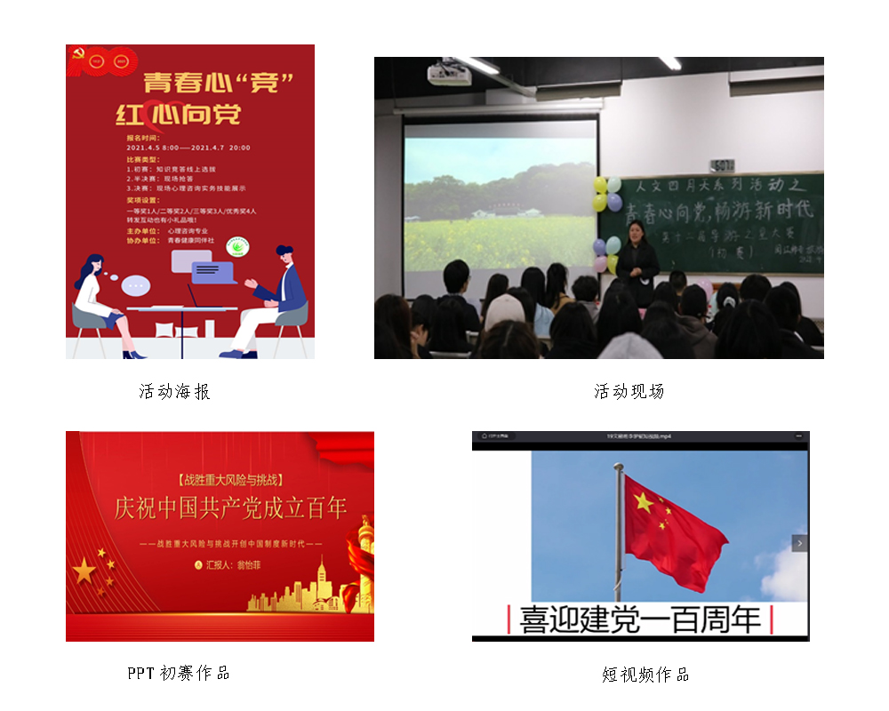 活动结合中国共产党建党100周年,将红色基因融入此次职教周活动主题,追寻红色记忆,以红色精神推进我系职业教育现代化。其中,心理咨询专业举办了第七届人文四月天心理专业技能大赛初赛通过学习通平台考核学生的党政党史知识。导游专业前往马尾船政文化主题园区开展“青春同心向党 传承红色文化”——马尾船政博物馆专业技能展示志愿服务。文秘专业承办了“文思涌如泉,秘笔生芳菲”新媒体信息处理创作大赛,初赛作品有以五四为契机,弘扬五四旋律,传递青春正能量,也有庆祝中国共产党成立一百周年,展现文秘专业学生昂扬向上的爱国风貌。