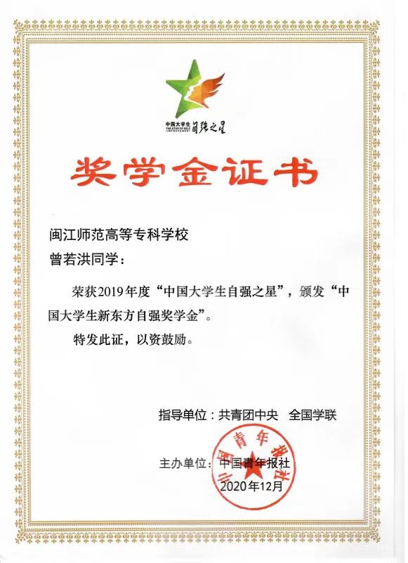 经过激烈的角逐,我系18文秘班学生曾若洪荣获2019年度“中国大学生自强之星”、“福建省大学生自强之星”,并获得“中国大学生新东方自强奖学金”。这是我校同学第一次获得该荣誉。
