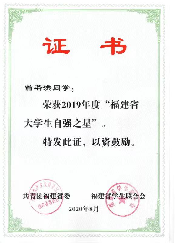 由共青团中央和全国学联指导、中国青年报社主办的“中国大学生自强之星”评选活动,意在评选出自强不息的大学生,传递自强人物身上所彰显出的榜样力量,树立大学生心中的先进典型,激发广大同学向典型人物学习的热潮。在重重选拔的过程中,曾若洪同学充分展现了当代大学生应有的奋发向上、勇攀高峰的决心和信念,体现了我系学生自立自强的良好精神风貌。