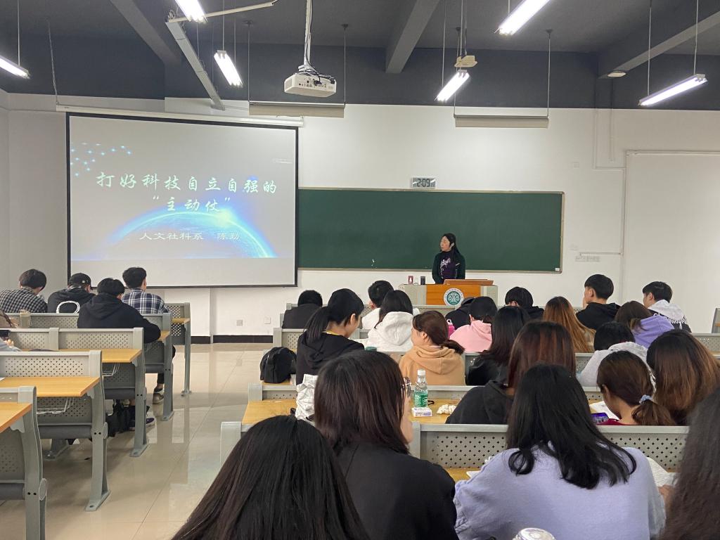 站在“两个一百年”奋斗目标的历史交汇点上,面对世界之变、时代之变,4月14日下午,人文社科系副主任陈勤老师于3号楼404给19行政管理1班与19导游1班的同学们上了一节生动的“形势与政策”课——打好科技自立自强的“主动仗”。