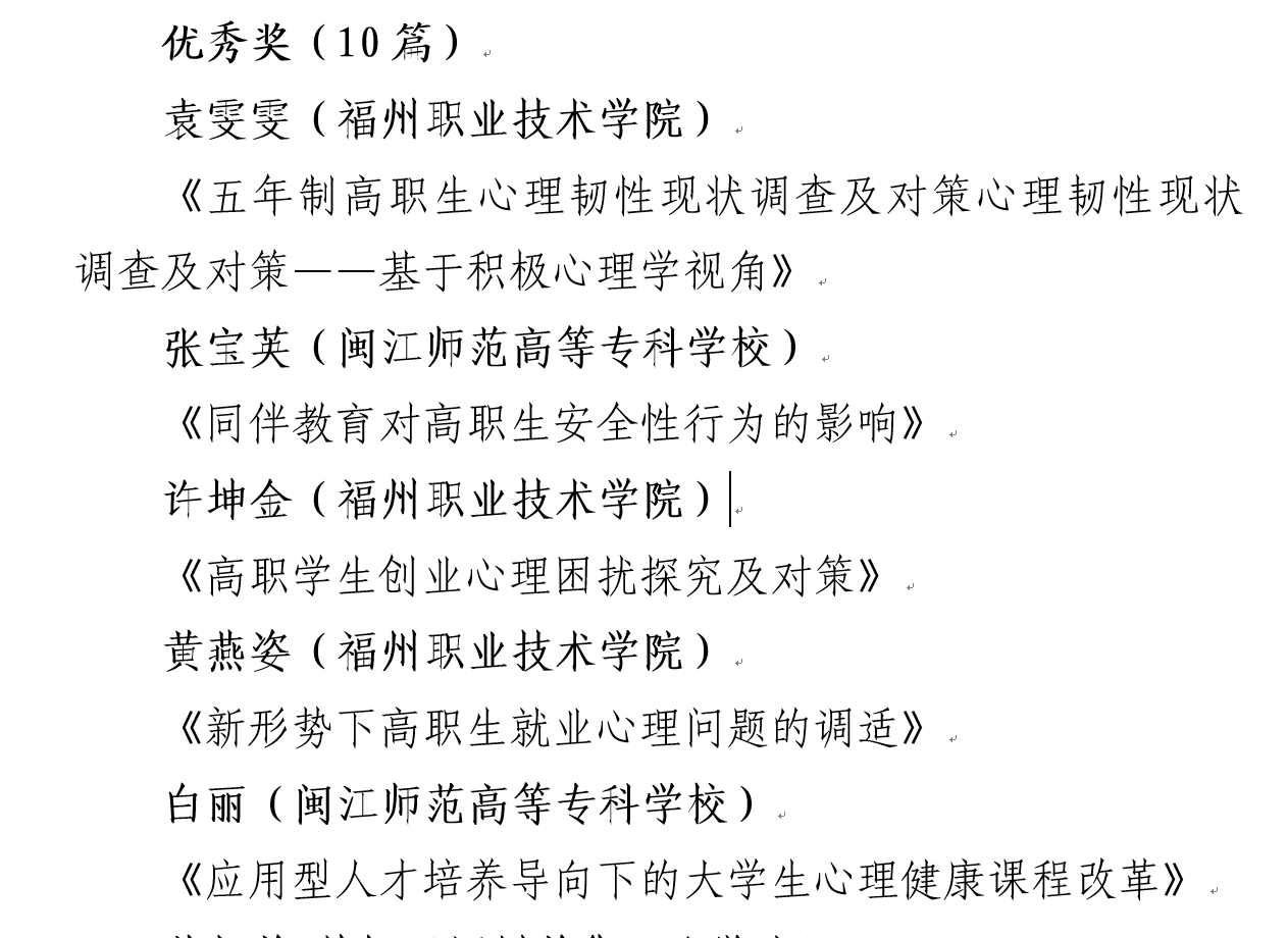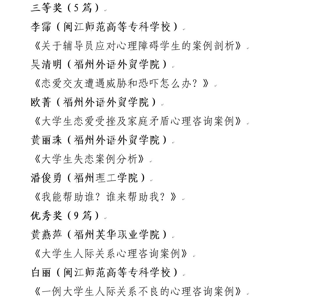 会议充分肯定了各高校疫情防控期间大学生心理健康教育与咨询工作,对2020年度心理健康优秀论文及工作案例进行了表彰,优秀老师们相互分享经验、模式。会议还邀请了福建师范大学心理学院郭明春副教授作题为“在认知行为疗法中整合正念”的专题讲座。我校心理咨询专业白丽、李霈、张宝英老师报送的论文及工作案例获得了两个三等奖、两个优秀奖共4个奖项。