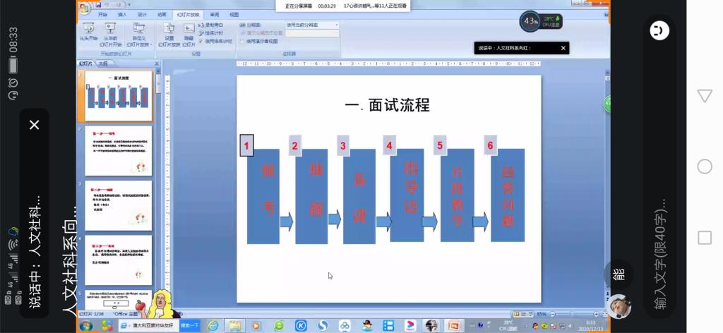 12月13日早上,人文社科系开展了教师资格证面试考核线上辅导讲座,此次讲座由向红老师主讲。参与的同学主要是18级心理咨询的同学,还有人文系部分19级、20级的同学。