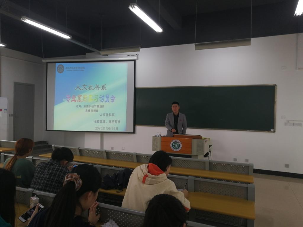 为进一步做好学生顶岗实习工作,引导学生做好实习前的各项准备,推进实习工作顺利开展。人文社科系管理教研室于10月29日下午在仓山校区3号楼404教室开展实习动员大会。会议由管理教研室主任杨宁主持,18级行政管理、18级文秘和16级文秘五年专学生参加了此次动员会。