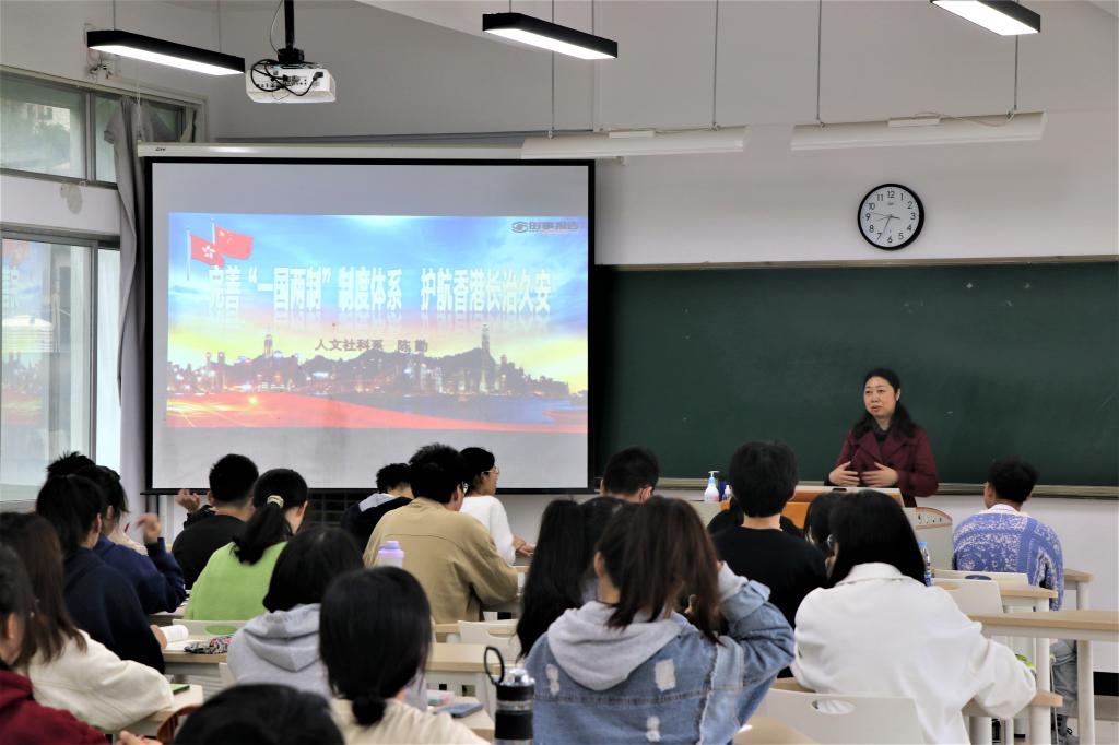 陈勤副主任从“国安法施行,香港实现由乱及治”、“完善选举制度,确保‘爱国者治港’”、“坚定制度自信,完善‘一国两制’”三个部分为学生带来一堂厚重隽永的爱国主义教育课。陈勤主任依托新闻案例娓娓道来,讲清了“一国两制”具有强大生命力和优越性,充分阐释“一国两制”是香港保持长期繁荣稳定的最佳制度。陈副主任的课堂教学内涵丰富,授课具有亲和力和感染力,引发大学生强烈的思想共鸣。