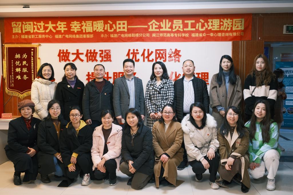 为积极响应习近平总书记关于“加强社会心理服务体系建设,培育自尊自信、理性平和、积极向上的社会心态”的总体要求,贯彻落实福建省委、省政府对做好群众留闽过年工作的详细部署,2022年1月25日下午,由福建省职工服务中心、福建广电网络集团客服部主办,福建广电网络鼓楼分公司、闽江师范高等专科学校、福建省众一泰心理咨询有限公司共同承办的“留闽过大年 幸福暖心田”企业员工心理游园活动在福建广电网络鼓楼分公司开展。
