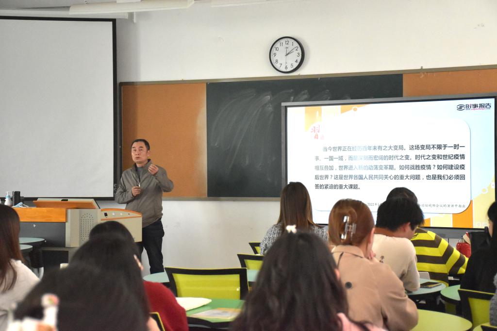 2022年3月11日下午,人文与管理学院党总支书记林朝阳在仓山校区3号楼402教室为我院20导游1班的学生讲授形势与政策课,他授课的题目为《艰难复苏中的世界经济》。