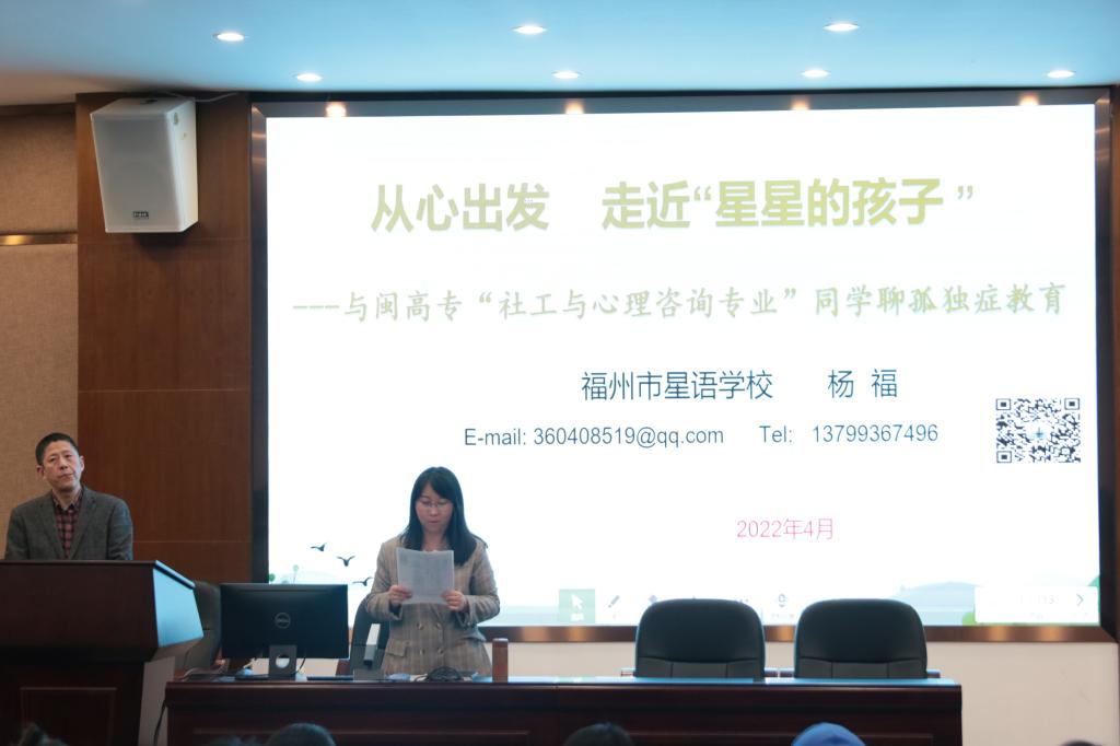 为最大限度地发挥师资优势,更好地将异常心理知识和心理辅导技能融合在一起,提升心理咨询专业学生的儿童心理服务技能,4月20日晚,人文与管理学院心理教研室特邀教育部基础教育教学(特殊教育)指导专业委员会委员、福州市第一节“闽都英才”基础教育名师人才、福州市星语学校杨福校长在我校仓山校区报告厅开展了“从心出发,走进‘星星的孩子’”专题讲座,教研室主任谢姗姗老师、《变态心理学》教师白丽、相关专业学生参与了此次活动。