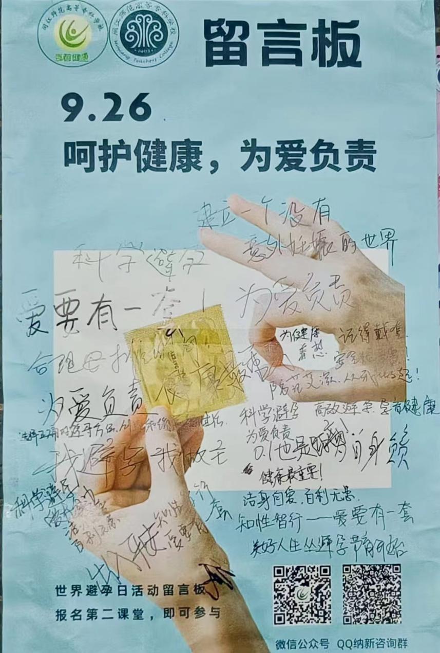 9月26日世界避孕日当天,基地开展“呵护健康,为爱负责”主题的留言活动,分别在仓山校区驿站门口和教学楼4号楼楼下设置了两个活动留言点,引导同学们关注到科学避孕这个话题,更好地表达对此话题的理解与看法,认识到科学避孕的重要性。