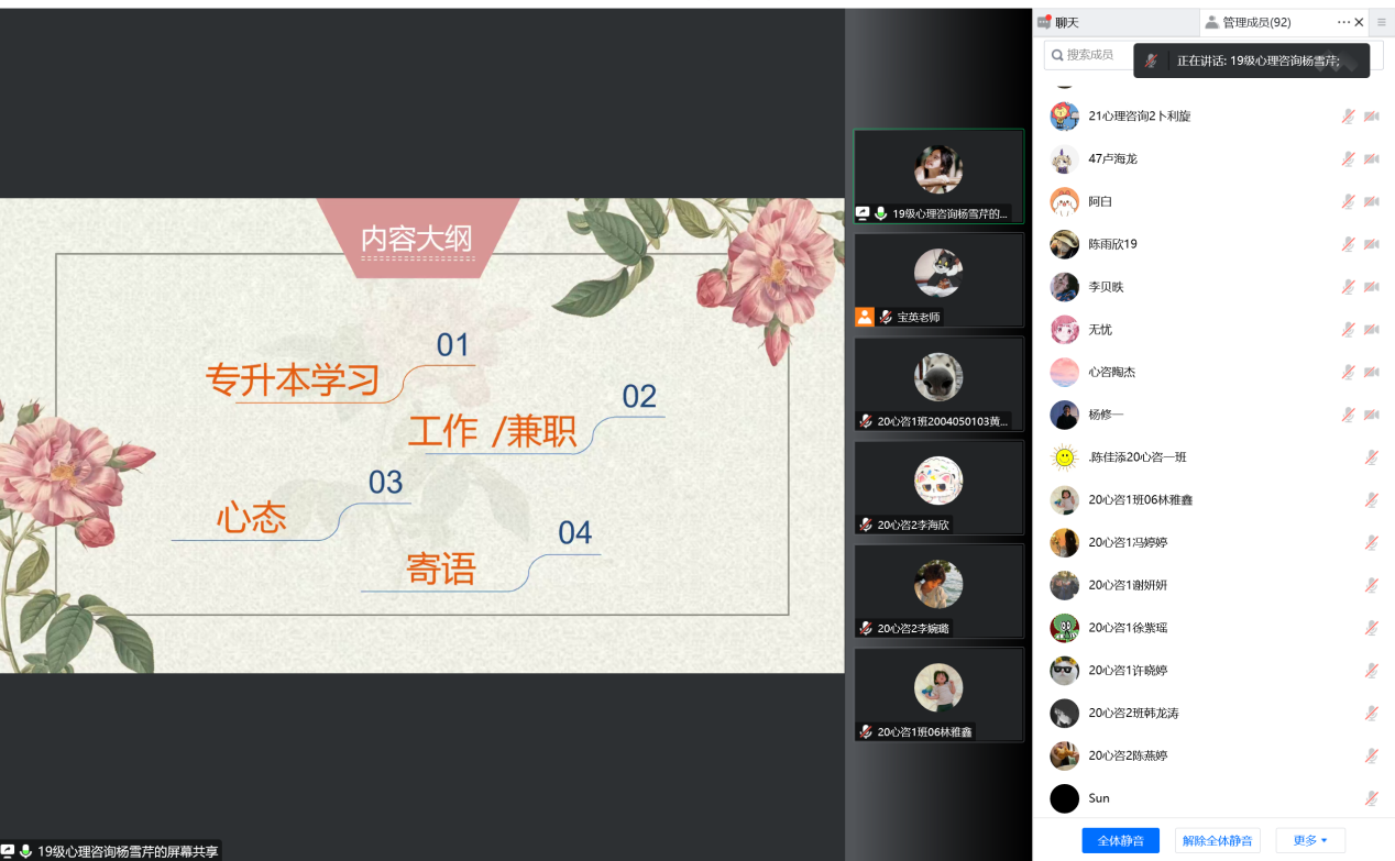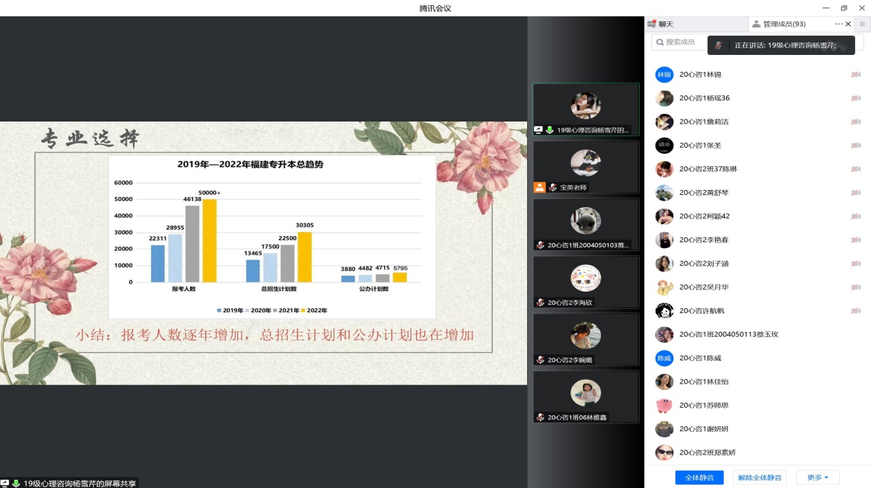 2022年11月9日,人文与管理学院心理教研室开展的“教育类和管理类专升本指导会”在腾讯会议举行,全体学院准备专升本考试的同学参加,本次专题培训邀请了19级优秀毕业生陈堆苗和杨雪芹主讲,由心理教研室翁洁老师、张宝英老师主持。