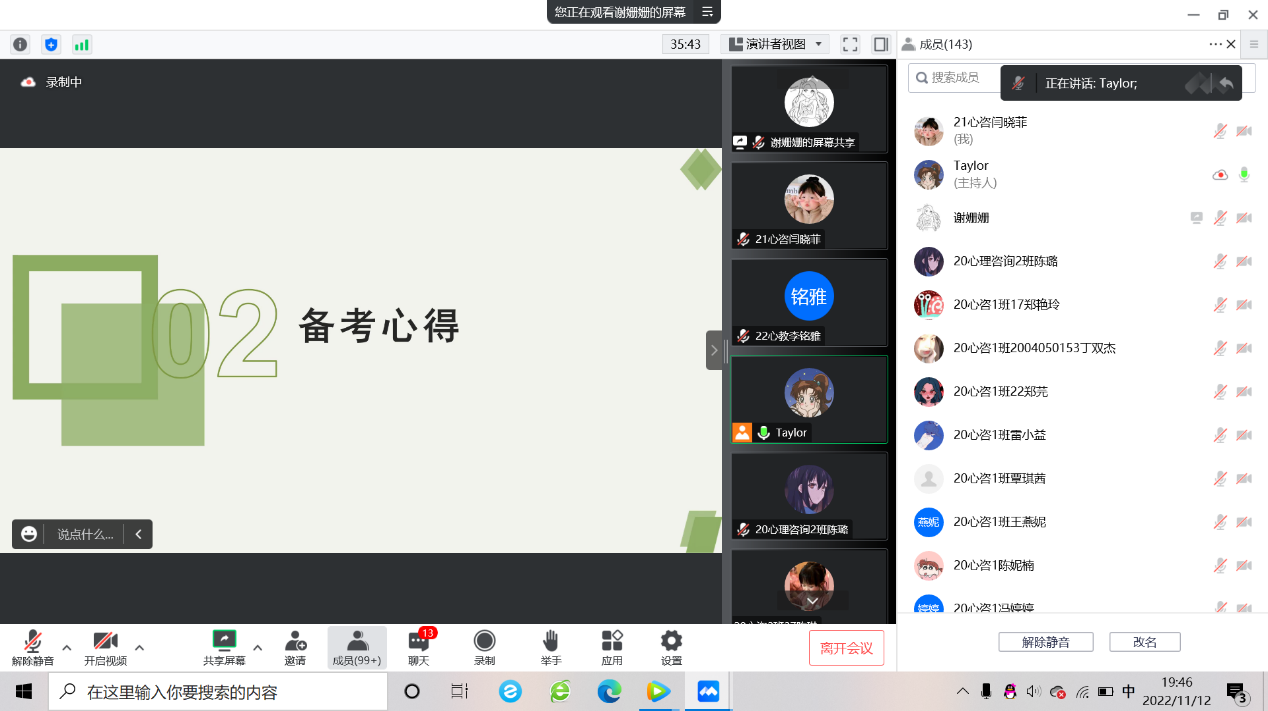 为了引导学生做好职业生涯规划、提升职业素养和就业竞争力。11月12日,人文与管理学院在腾讯会议开展了职业生涯指导专题讲座,本次活动特邀14级心理咨询专业、万事屋电子商务有限公司法人傅婷主讲,教研室主任谢姗姗主持,全体心理专业学生参加。