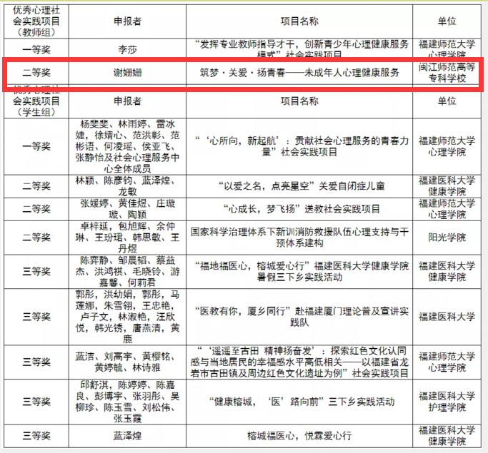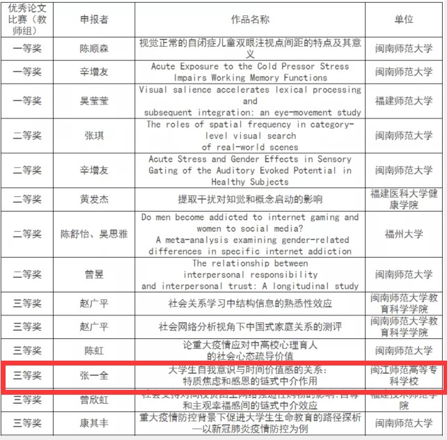 近日,福建省心理学会关于2022年“心服务,新福建”优秀社会实践项目成果和第七届优秀学术论文评选落下帷幕,经过福建省心理学会理事专家评审、常务理事会和理事会审议,我院心理教研室谢姗姗老师报送的社会实践项目《筑梦·关爱·扬青春——未成年心理健康服务》获实践项目成果评比教师组二等奖,张一全老师报送的学术论文《大学生自我意识与时间价值感的关系:特质焦虑和感恩的链式中介作用》获优秀学术论文评比教师组三等奖。