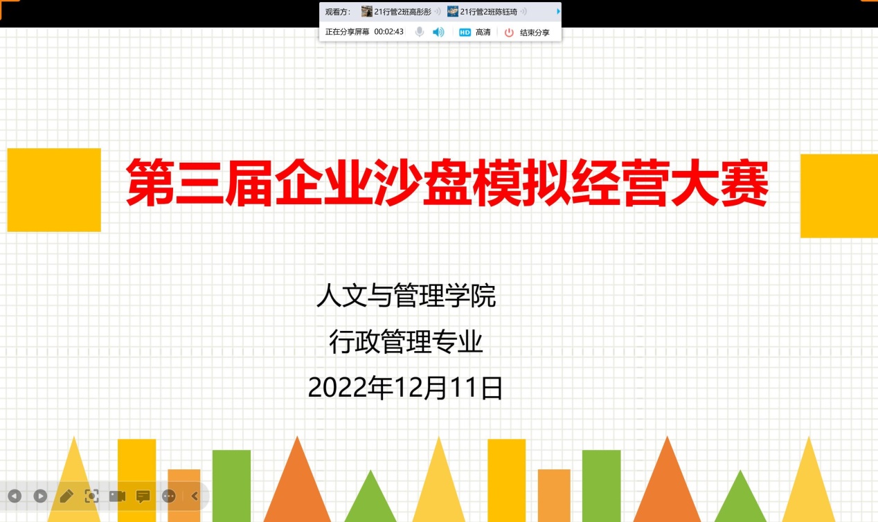 12月11日,人文与管理学院行政管理专业举办第三届企业沙盘模拟经营大赛。本次比赛由袁曦老师主持和担任裁判,通过线上平台进行,经过前期报名和筛选,一共有9支代表队参加,每一支代表队由2名选手组成,选手们在团队中综合发挥了CEO、财务总监、生产总监、销售总监、采购总监、市场总监等岗位的职责,同时操作电子沙盘。本次比赛分六个经营年度,最终按照六个年度后所有者权益的分数进行排名。