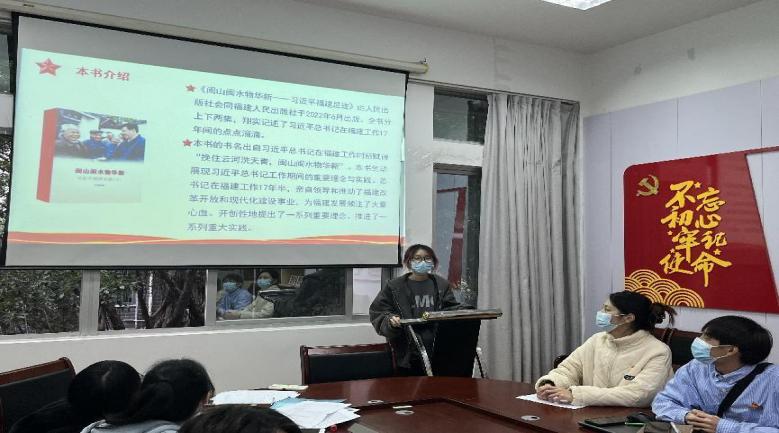 本次读书交流会以“诵时代之志,续中华之情”为主题,集中学习研讨《闽山闽水物华新——习近平福建足迹》一书,通过PPT宣讲分享书本内容,展现习近平同志在赴福建调研时,为福建擘画“建设机制活、产业优、百姓富、生态美的新福建”的宏伟蓝图,同时也了解到习近平同志为福建改革开放和现代化建设事业所做出的一系列极具前瞻性、开创性、战略性的理念创新和实践探索。而后,同学们结合自己的学习工作经历,讨论读书心得,畅谈收获感悟,把学习书本内容与深入学习贯彻习近平新时代中国特色社会主义思想贯通起来,从人民领袖的成长足迹中感悟思想伟力、汲取真理力量,始终牢记嘱托、笃行不怠,真正做到用心领会习近平新时代中国特色社会主义思想的真理光芒和实践伟力。