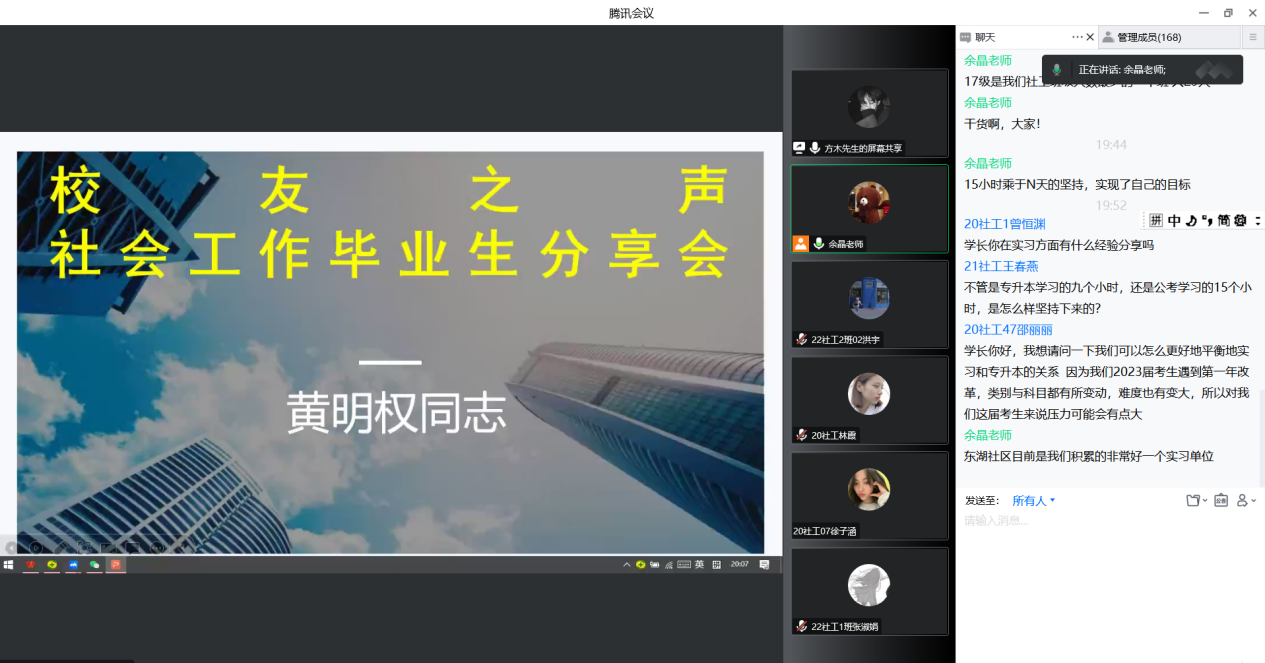 2022年11月13日,为了让社会工作专业的同学们了解毕业之后的就业选择及专升本改革,社会工作专业邀请2020届毕业生黄明权,2021届毕业生张佳燕及唐隽嫒在腾讯会议上开展“校友之声”分享会,活动由余晶老师、叶佳媚老师和何昕柔老师分别主持。