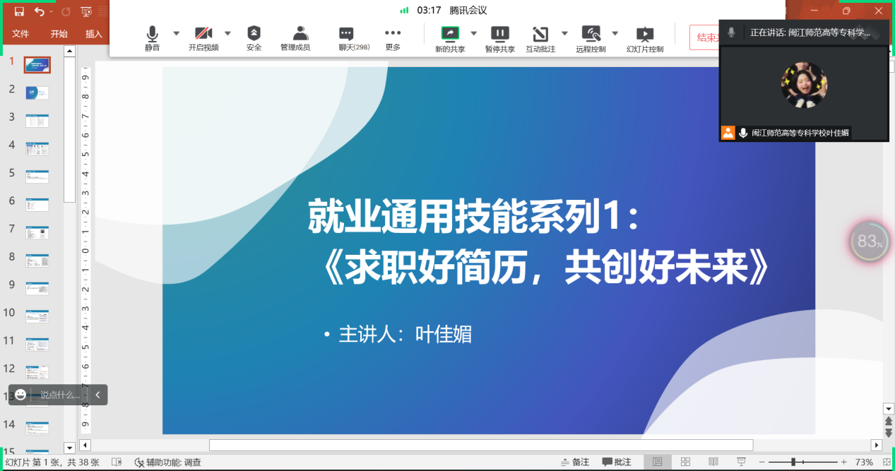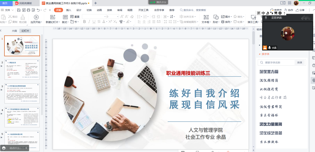 为了提升20级社会工作专业班就业技能,社会工作专业于2022年11月7日至18日,运用腾讯会议开展五场线上就业通用技能系列工作坊。本次系列工作坊紧紧围绕同学们的实习和就业岗位的需求,从制作一份好的简历、做一段漂亮的自我介绍以及相关的工作技能出发,为同学们求职就业做好心态和技能的准备。