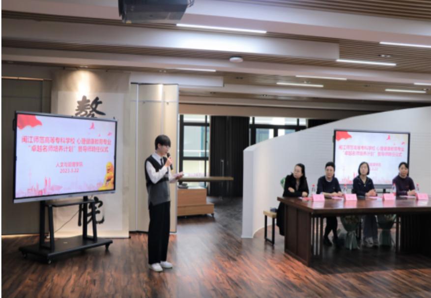 为深入学习贯彻党的二十大精神,以办好现代学徒制班为抓手,全面落实立德树人要求,实现职业技能提高和职业精神培养高度融合,服务地方经济社会发展。2023年3月22日下午,人文与管理学院在闽江师专附属实验小学鳌峰书院举办心理健康教育专业“卓越名师培养计划”拜师会暨导师聘任仪式。闽江师专副校长陈强、教务处处长葛思华、人文与管理学院院长陈勤、副院长谢姗姗、综合科科长张继驰、心理教研室主任白丽出席本次活动,特邀校外育人导师与我校心理专业教师、22级心理健康教育专业全体学生共同参与,