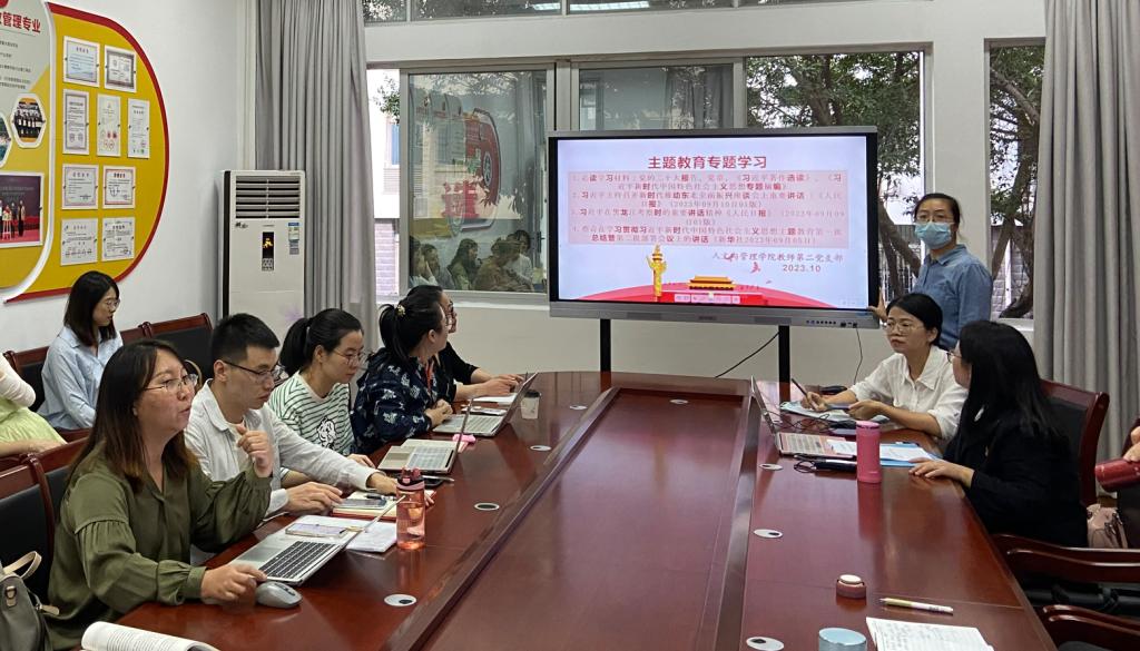 2023年10月11日下午,人文与管理学院党总支所属各支部于仓山校区3#会议室开展主题教育专题学习。本次学习的内容为:党的二十大报告、党章、《习近平著作选读》、《习近平新时代中国特色社会主义思想专题摘编》;习近平主持召开新时代推动东北全面振兴座谈会上重要讲话;习近平在黑龙江考察时的重要讲话精神;蔡奇在学习贯彻习近平新时代中国特色社会主义思想主题教育第一批总结暨第二批部署会议上的讲话。本次学习由各支部书记分别主持,各支部党员教师参加。