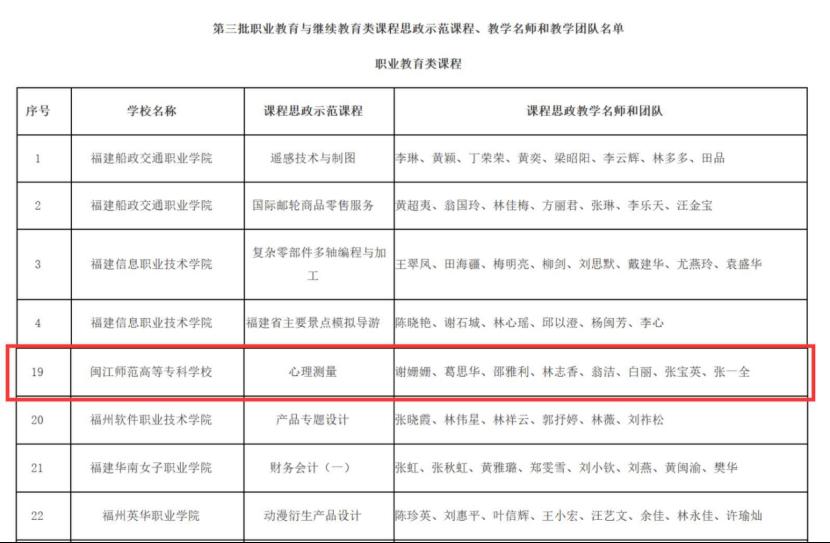 近日,福建省教育厅发布《福建省教育厅关于公布第三批课程思政示范项目(职业教育与继续教育类)的通知》(闽教职成〔2024〕1号),我校《心理测量》课程荣获省级课程思政示范项目。