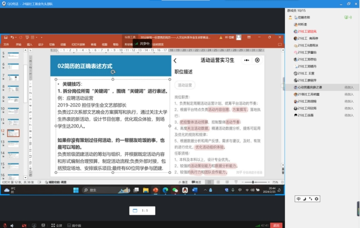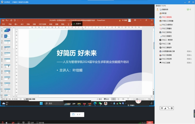 培训会议上,叶佳媚老师从简历的基本内容、简历的正确表述方式以及如何润色简历等几个方面展开,从挑选简历模板的注意事项到如何着重表述个人背景资料等,再到如何在简历中突出个人优势,做出了详尽细致的讲解。提醒同学们要根据求职岗位的需求修改相应的简历内容,不能一份简历多投海投。培训中叶老师根据同学们提交上来的简历在线一对一的提出修改意见,督促同学们培训结束后再次修改简历向指导老师反馈。