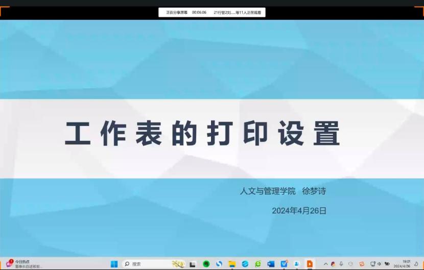 本次讲座由人文与管理学院行政管专业教师徐梦诗主讲。本次讲座内容围绕三个工作表案例的打印设置,介绍了如何在电子表格软件中进行页面布局、页面缩放、边距调整、横向与纵向设置、页眉页脚添加等关键操作步骤,强调了精确控制打印输出的重要性。