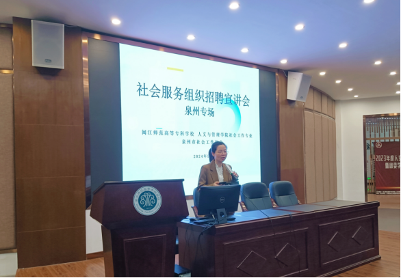 本场招聘宣讲会主要针对我院24届社会工作毕业生群体,同时欢迎在校生开展自主实习实践,这次邀请到泉州市社会工作协会、泉州市海西社工事业发展中心,晋江市向阳青少年社工事务所,致和社工事务所,晋江市益心社工服务中心,德化县致和社工事务所等6家泉州用人单位参加。会上,企业通过宣讲PPT的形式,围绕企业文化、企业发展前景、招聘岗位基本信息、薪资福利情况,对同学们的期待等方面展开详细讲解,并回答同学们的问题,解决同学疑惑,鼓励同学们积极参与实习活动,全面促进社会工作毕业生更充分、更高质量就业。