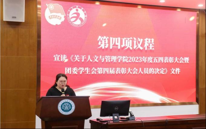 随后,学院党总支副书记陈清芬老师宣读《关于人文与管理学院2023年度五四表彰大会暨团委学生会第四届表彰大会表彰人员的决定》文件。大会对过去一年踊跃出的先进青年集体和先进个人进行了表彰,与会领导老师分别为荣获校五四红旗团支部、校优秀共青团员、校第二课堂学习标兵、明星志愿者、优秀志愿者、学院优秀志愿者、优秀学生干部、专业活动积极分子和人文四月天活动中的获奖学生代表进行颁奖。